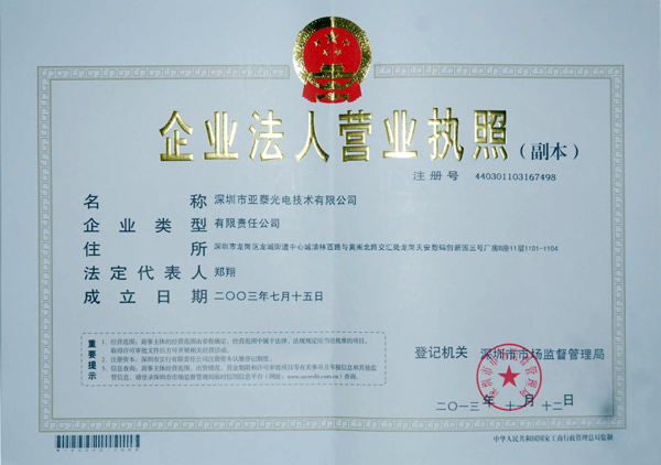 亞泰光電首頁 >> 走進亞泰 >> 亞泰光電資質榮譽 >> 企業資質 >> 企業法人營業執照