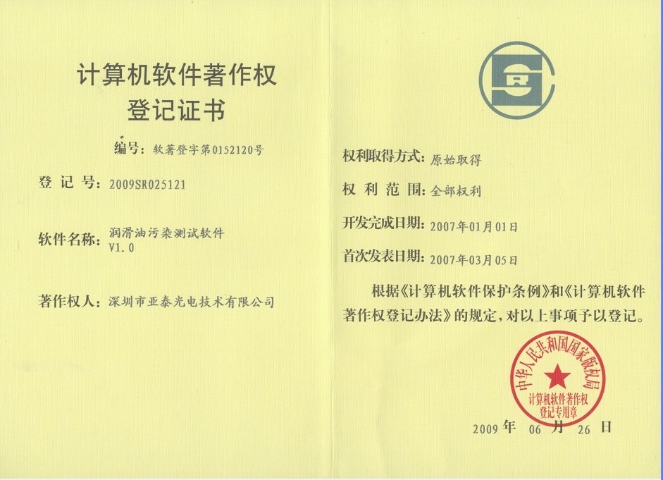 亞泰光電首頁 >> 走進亞泰 >> 亞泰光電資質榮譽 >> 軟件著作權 >> 潤滑油污染測試儀軟件