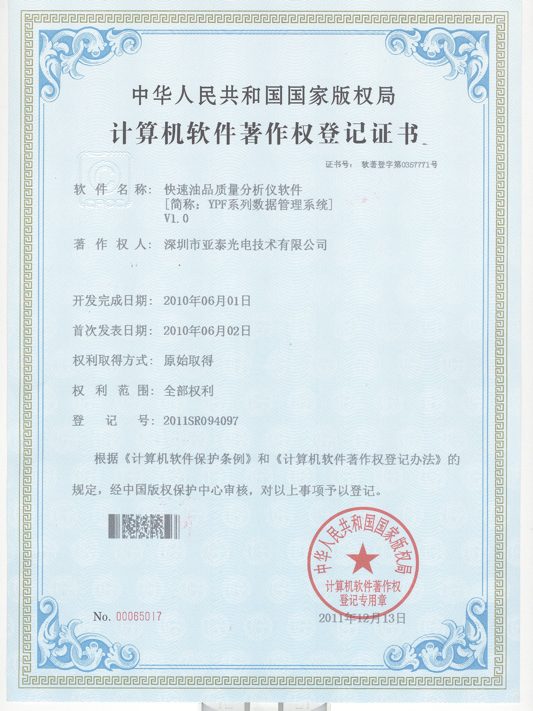 亞泰光電首頁 >> 走進(jìn)亞泰 >> 亞泰光電資質(zhì)榮譽(yù) >> 軟件著作權(quán) >> 快速油品質(zhì)量分析儀軟件