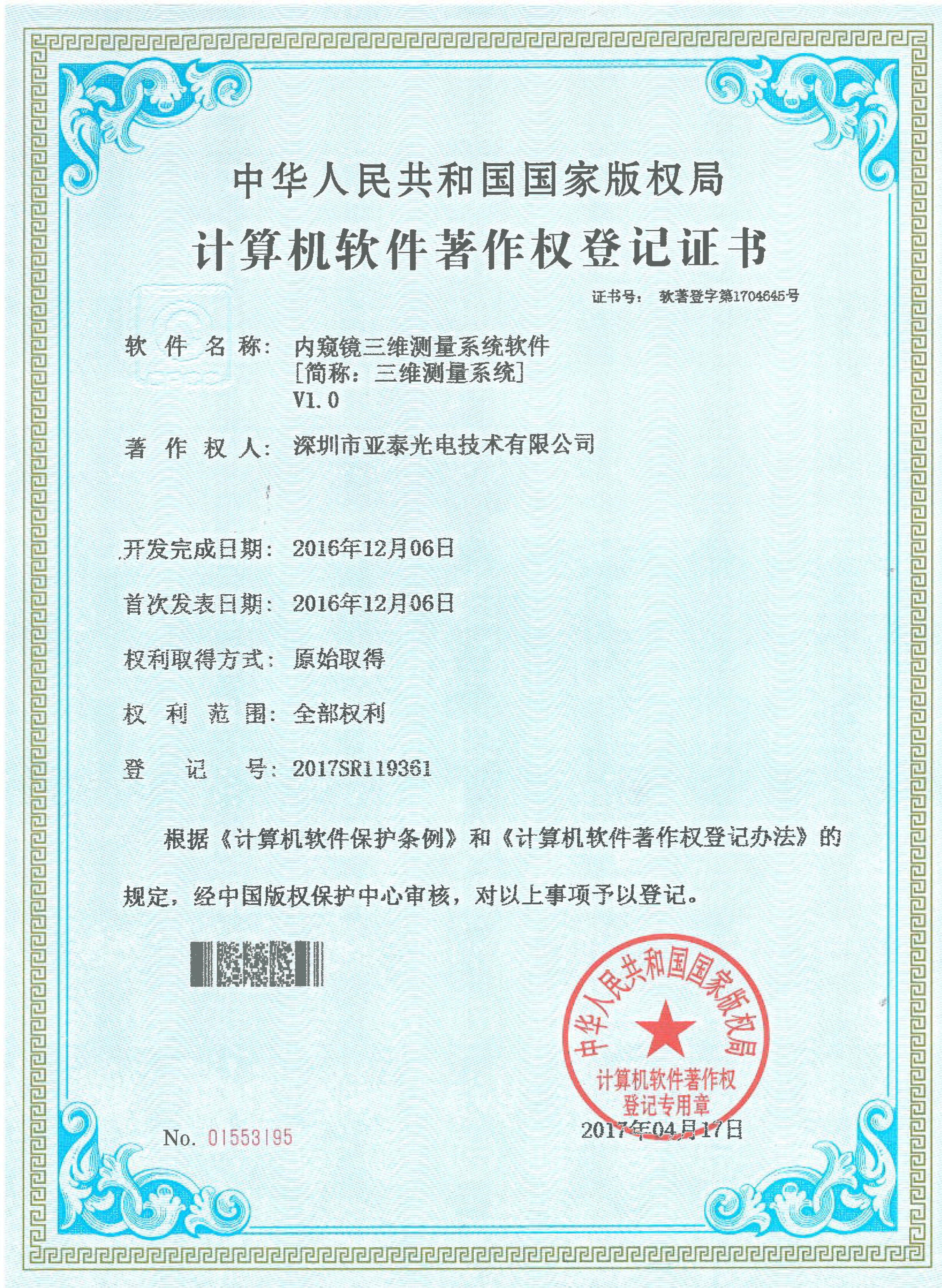 亞泰光電首頁 >> 走進(jìn)亞泰 >> 亞泰光電資質(zhì)榮譽(yù) >> 軟件著作權(quán) >> 內(nèi)窺鏡三維測(cè)量系統(tǒng)軟件