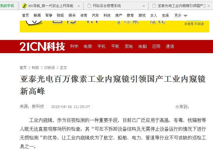為改變這種局面,作為“國家高新技術企業”的深圳市亞泰光電技術有限公司,自2009年開始著手對工業內窺鏡的研發工作,成立了光學事業部并特別聘請了深圳大學牛憨笨院士作為技術顧問,經過不懈的專研與努力,亞泰光電公司不僅擁有了自己的工業內窺鏡產品,并先后獲得了5項工業內窺鏡方面的發明專利。近日,由亞泰光電自主研發的“百萬級像素”的超清視頻內窺鏡已成功問世,選用國產自主研發高端產品不再是夢。
