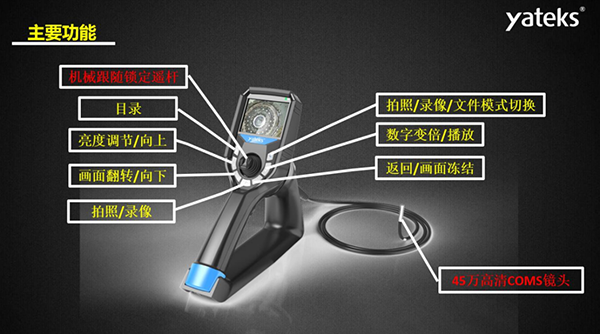 工業(yè)內窺鏡由幾個關鍵組件組成。其中包括帶有高清 LCD 屏幕和控件的主機、四層鎢絲編織的耐磨插入管和高清攝像頭。主機可以實現(xiàn)縮放功能、回放、視頻和照片捕獲以及用于控制轉向的操縱桿。插入管的末端是攝像頭,并可以 做完整的 360 度四方向的轉向。插入管末端的攝像頭配有多個 LED 燈,可清晰照亮周圍環(huán)境,實現(xiàn)最佳可視化。拍攝完照片和視頻后,用戶可以從主機中取出 SD 卡,將內容下載到自己的設備上進行進一步分析。 插入管有不同的長度和直徑,還有不同的方向的攝像頭,例如側視鏡,直視鏡,帶雙鏡頭的內窺鏡則可以同時觀測被檢物的側面和前方,能更全面觀測被檢物,節(jié)省時間。