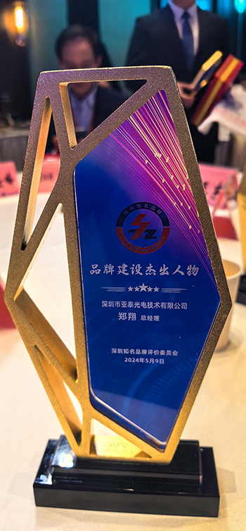 7:00 PM,國際品牌周之2024品牌領袖之夜在深圳廣電金融中心舉行,亞泰光電總經理鄭翔獲評“品牌建設杰出人物”獎項。