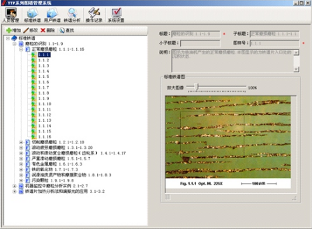 軟件包含:?員管理,標準鐵譜管理,??鐵譜管理,鐵譜分析,操作記錄管理.系統設置6個部分。可以對鐵譜圖?進?實時的采集、 對?、測距、分析完畢可以把分析結果保存,并且以報表的形式打印出來或者保存為PDF?件。